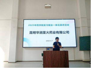 为持续引导学生树牢正确就业观,以正确就业观合理引导就业预期。2025年5月7日,邀请昆明华润圣火药业有限公司(以下简称圣火药业)在大教室西1-3开展就业教育暨实习就业一体化宣讲活动。参与本次活动的有圣火药业生产运营部外包车间副主任方剑康、招聘经理张超凯、业务支持主任丰珊珊、员工关系经理丁月芬、药学院院长阳敬,以及药学院2026届毕业生