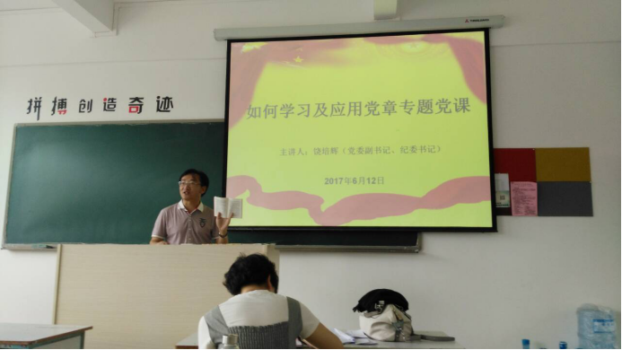 本次组织生活的一项重要内容是饶培辉副书记就“如何学习及应用党章”为支部全体党员展开专题党课。饶培辉副书记以“如何学习及应用党章”为题,强调学习和应用党章要做到六个字:熟记、理解、遵循。他要求全体党员学习党章不能走形式主义,应该熟记并理解党章的内容,在工作中更应该遵循党章对党员的规范要求,严以修身、勤于律己,不断提升党性修养。他以两个“结合起来”、四个“深刻理解”、六个“联系实际”以及三个“深入思考”为提纲,要求党员们要全面掌握党章的基本内容、牢固树立党章意识,要把党章学习教育作为经常性工作来抓;并且要以党章为根本依据、基本标准和根本规则,共同维护党章的权威性和严肃性。