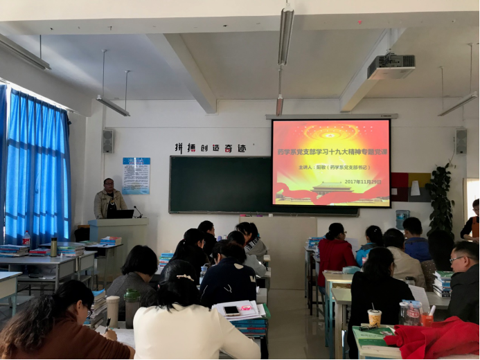 2017年11月29日,药学系党支部开展学习“十九大”专题党课活动,药学系党支部书记阳敬同志作为主讲人,向药学系党支部全体党员强调了学习“十九大”精神的要求,并带领大家全面认识“一带一路”倡议。