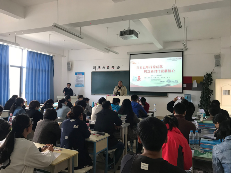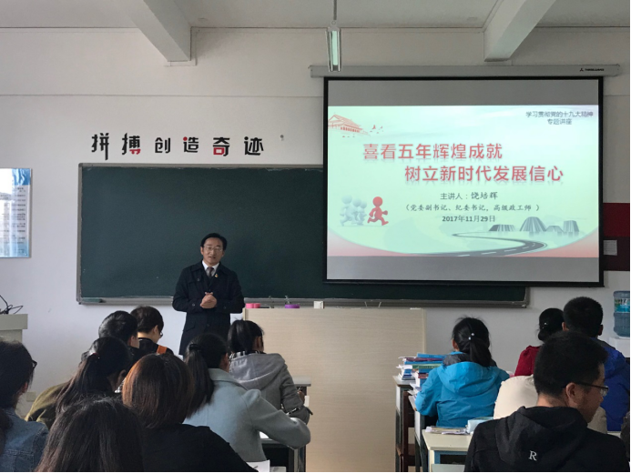 接下来,饶副书记通过与大家分享过去五年重大事件的图片及视频,为大家介绍了我国过去五年在十个方面取得的辉煌成就,在座的老师及同学们无不感到热血沸腾,为我国过去五年在经济、科学等方面取得的成就而自豪,同时也对未来国家的发展充满信心。