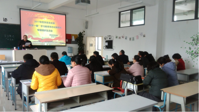 为推进“两学一做”学习教育常态化制度化,深入贯彻“十九大精神”,加强和规范党内政治生活,药学系积极响应学院党委要求,于2018年1月3日下午4:10在教学楼南楼203教室开展“两学一做”学习教育常态化制度化支部专题组织生活会。