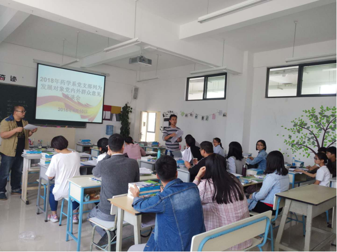 2018年4月10日下午药学系党支部在教学南楼203教室召开了列为发展对象党内外群众意见座谈会,会议由党支部书记阳敬主持,6名入党积极分子(李梦秋、李海珠、张赛、徐永帅、周梦霞、张海清)的培养联系人、班主任、同学等党外群众参加了这次会议。
