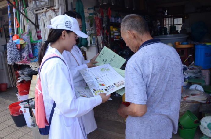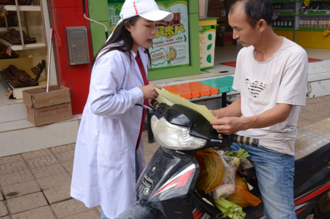 在草坝镇活动现场,志愿者团队搭建了服务咨询台,在服务咨询台上摆放了各类用药指导宣传资料、药学系专业介绍资料,以及大量的爱心物品--创可贴。大学生志愿者们发挥知识智力优势,用所学的专业知识向乡亲们讲解了用药常识和药品知识,让乡亲们合理并正确的用药,同时也向乡亲们发放了宣传单和创可贴。大家不仅在活动中了解社会,认知社会,传播文明,服务农村,更充分体现了红河卫生职业学院药学系大力弘扬和培育民族精神,促进发展的积极作用。