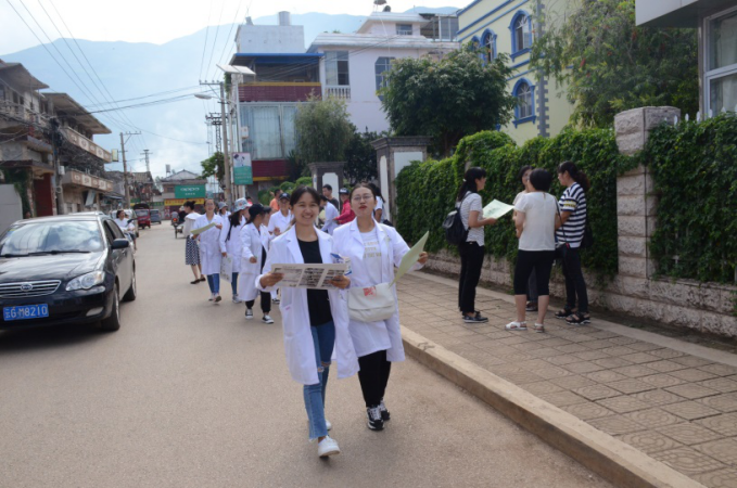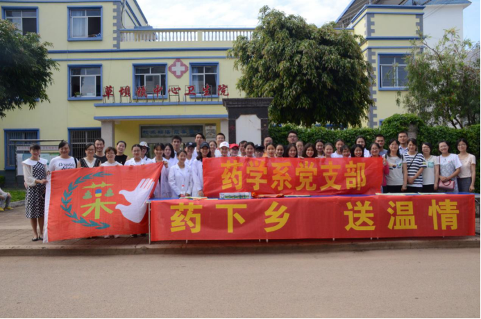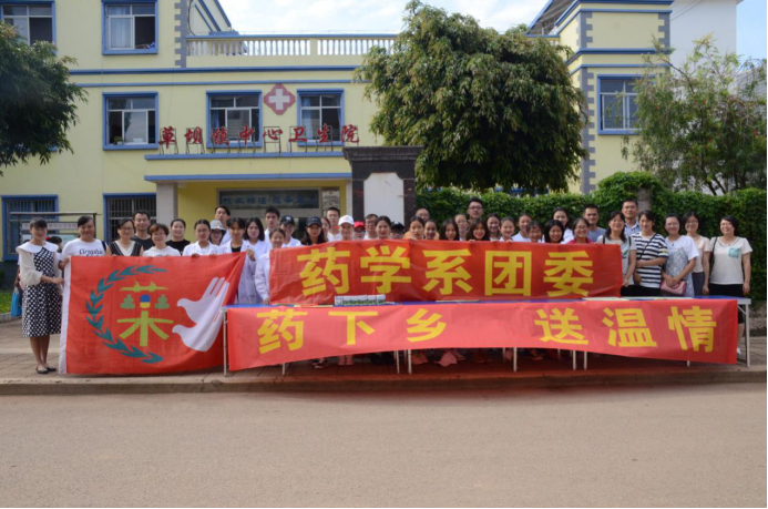 为深入贯彻落实党的十九大精神,学习宣传习近平总书记系列重要讲话精神,响应习近平总书记“我的中国梦”的号召和对青年“勤学、修德、明辨、笃实”的要求,进一步发挥学院药学系学科优势,锻炼我系学生创新实践能力;为加大对医疗服务的宣传力度,让老百姓更了解药品知识,提高用药常识,提高同学们的实践能力,让同学们从实践中收获经验,在实践中学会与人交流,2018年7月12日,在蒙自市草坝镇卫生院的大力支持与帮助下,在学院团委的关心下,药学系党支部携同药学系团委组建了一支由43名师生组成的志愿者团队,到雨过铺镇开展了“药下乡,送温情”为主题的“三下乡”社会实践活动。