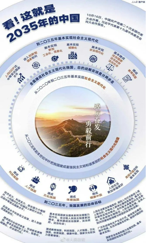党的二十大报告提出,全面建成社会主义现代化强国,总的战略安排是分两步走:从2022年到2035年基本实现社会主义现代化;从2035年到本世纪中叶把我国建成富强民主文明和谐美丽的社会主义现代化强国。那2035年的中国是什么样?一起来看看吧!