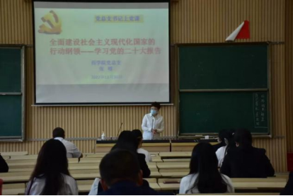 随后,由药学院党总支书记张郴授课。张郴同志讲了主题为“全面建设社会主义现代化国家的行动纲领——学习党的二十大报告”的党课,主要从深刻领会党的二十大主题、深刻领会新中国新时代党的使命任务、深刻领会党的二十大精神相关要求三个方面,对党的二十大精神进行了阐释和解读。张郴同志要求,党员和团干部要认真学习贯彻党的二十大精神,加强学习,注重团结,求真务实,解放思想,与时俱进,争做表率。