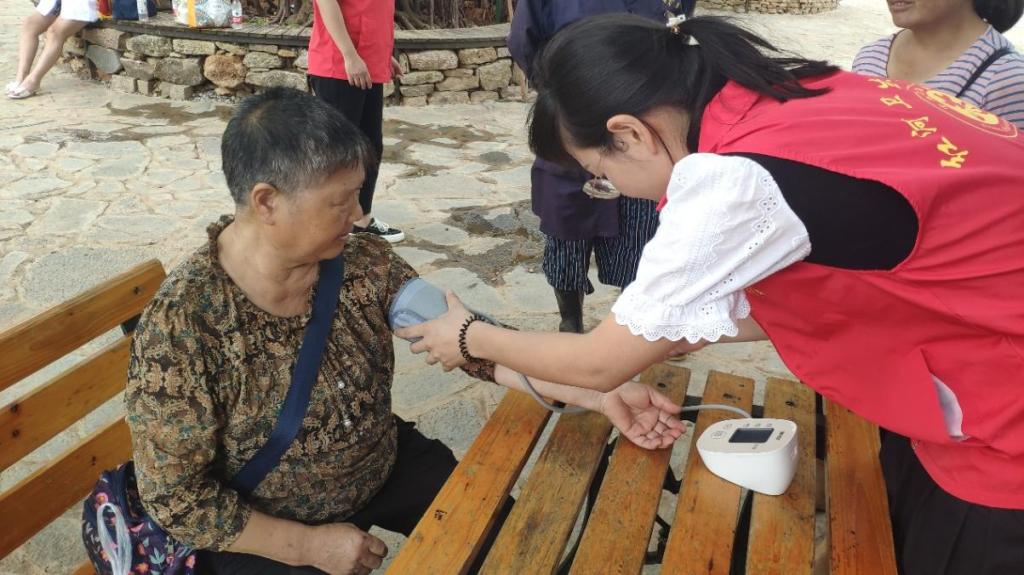 参与活动的学生们在学校教师及健之佳药师的指导下,细致认真的为村民们测量、宣讲,赢得了村民们一致好评。