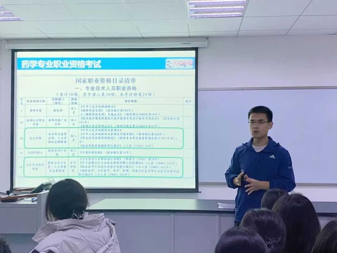 活动以师生问答交流的方式开展,问答后张老师详细地向同学们讲解了执业药师和卫生专业技术资格考试报名所需条件、考试年限、报名流程及考试科目等,让同学们对未来所要面对的职业资格考试有了更进一步的了解。他山之石可以攻玉,理论与实践结合才能让同学们有切身体会,所以张老师用自身考试经验、历年考试通过率及相关数据向同学们进行了分享,有助于拓宽同学们对药学职业资格考试的认知。