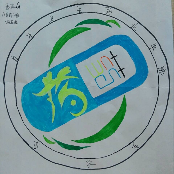 设计理念:中间有一个大大的药字,代表着我们药学系,旁边的一串绿叶代表着生命,意味着以后我们的工作是和生命挂钩的,不能有一点马虎,这个药字是用各种颜色涂的,意味着以后我们在药学系的生活丰富多彩的。