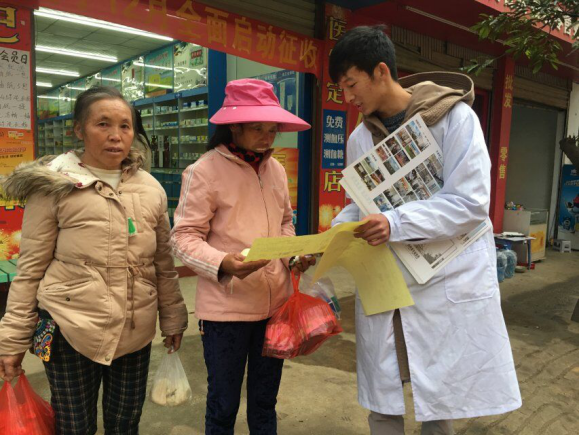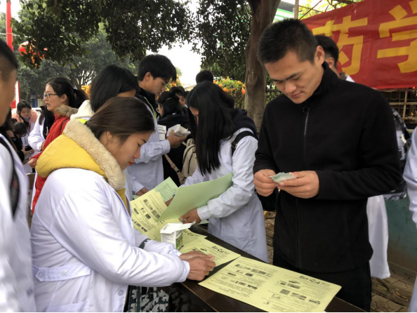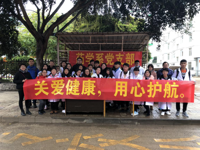 为深入贯彻落实党的十九大精神,学习宣传习近平总书记系列重要讲话精神,响应习近平总书记“我的中国梦”的号召和对青年“勤学、修德、明辨、笃实”的要求,进一步发挥学院药学系学科优势,锻炼我系学生创新实践能力;为加大对医疗服务的宣传力度,让老百姓更了解药品知识,提高用药常识,提高同学们的实践能力,让同学们从实践中收获经验,在实践中学会与人交流,2018年1月10日,在蒙自市雨过铺镇卫生院的大力支持与帮助下,在学院团委的关心下,药学系党支部携同药学系团委组建了一支由35名师生组成的志愿者团队,到雨过铺镇开展了“关爱健康,用心护航”主题的“三下乡”社会实践活动。