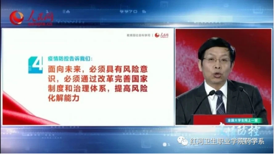 19专药3班李佳欣:看了此次的大课,其中让我最有感触的是最后一位教授的演讲。她说,这次疫情也就像是一次大考,对我们所有青年一代的大考。而且这次大考我们一定能拿高分,因为这是中华五千年底蕴赋予我们的底气和中国力量中国速度赋予我们的自信。而我们青年一代,要学会从这次大考中吸取经验:首先,要学会在此次疫情中认识中国,通过疫情这面镜子让我们了解到这是一个以人民为中心的执政党,也让我们看到了我们守望相助团结一致的人民。不禁为祖国感到无比的自豪,更是“生于种花家,何其荣幸!”其次我们要认识到自己的当担,要在奋斗当担中谱写我们大写的青春年华!要做到心中有大我,把自己的小我放到祖国、人民的大我之中去。有一句话说“没有什么岁月静好,不过是有人替你负重前行”在我们的孩童时代,祖国用它宽厚的臂弯给带给我们岁月静好。所以,我亲爱的祖国,我定努力用我奋斗的青春,还您一片岁月静好!