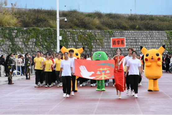 踏雪为霜,不畏严寒。迎面走来的是药学院方队,他们步伐整齐、口号洪亮、精神抖擞,活波可爱的皮卡丘和浓缩着我院特色的药丸更是俘获了在场所有同学们的心。