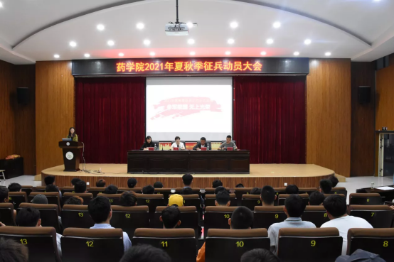 为积极响应国家号召,依法履行兵役义务,投身于祖国国防建设之中。药学院于2021年4月27日19:30在图书馆报告厅组织开展了2021年夏秋季征兵动员大会。药学院党总支书记、院长张郴,药学院党总支专职副书记孙雨诗,武装部副部长王兴周和沈树桥同志出席会议。参会人员有药学院各班级班主任、辅导员及学院300余名男生。