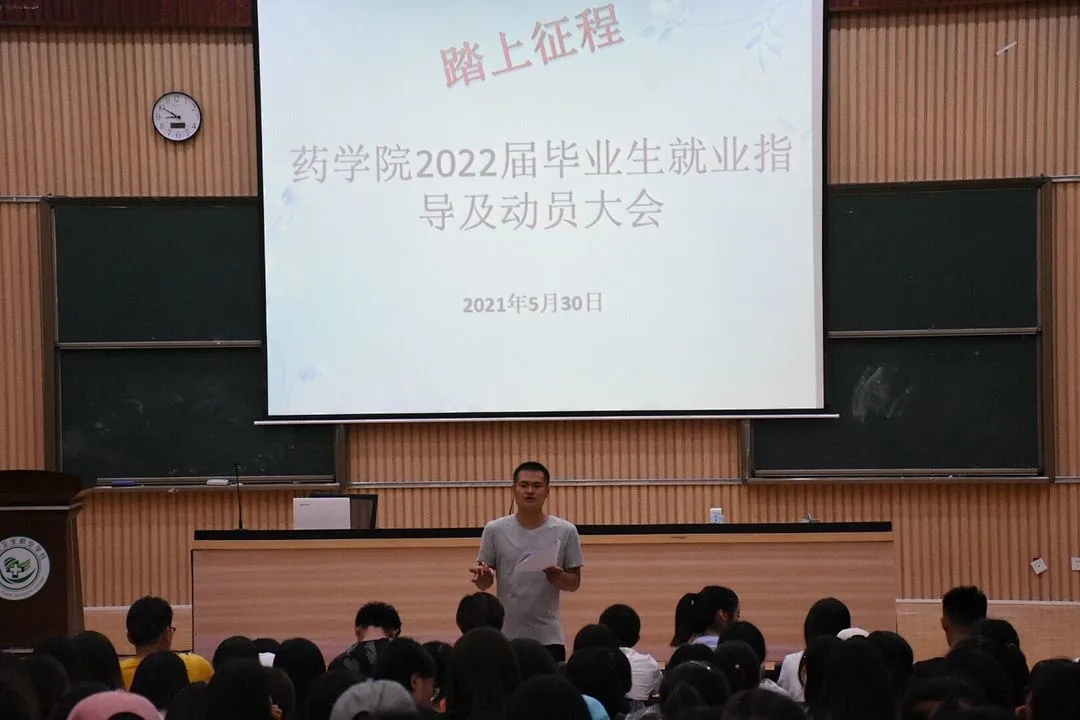 2021年5月30日晚上7:30—9:30,药学院召集所有(2022届毕业生)实习生在教学楼二楼阶梯教室开展了实习动员大会暨就业、创业指导讲座。本次大会由药学院辅导员张大庆老师主持,共分为四个部分:首先由药学院副院长庄晨曦做实习就业总动员,其次张大庆老师就实习过程中的细节问题做了强调,接下来欧阳秋雨老师对实习生将来就业、创业进行了指导,最后保剑老师对同学们文明离校做了具体的安排。