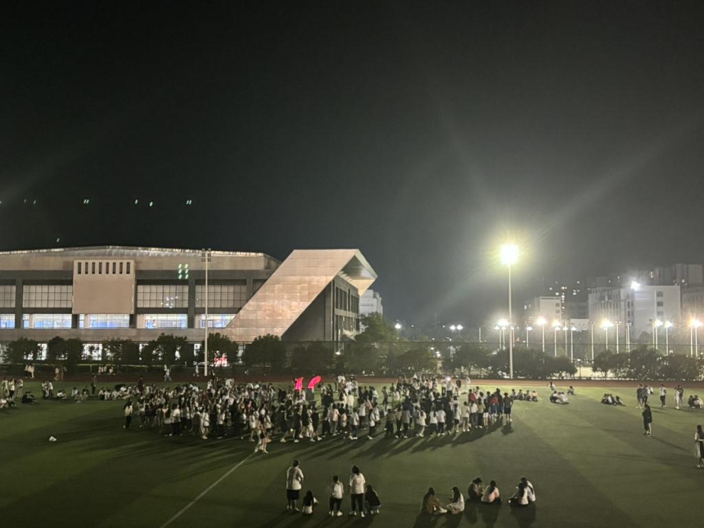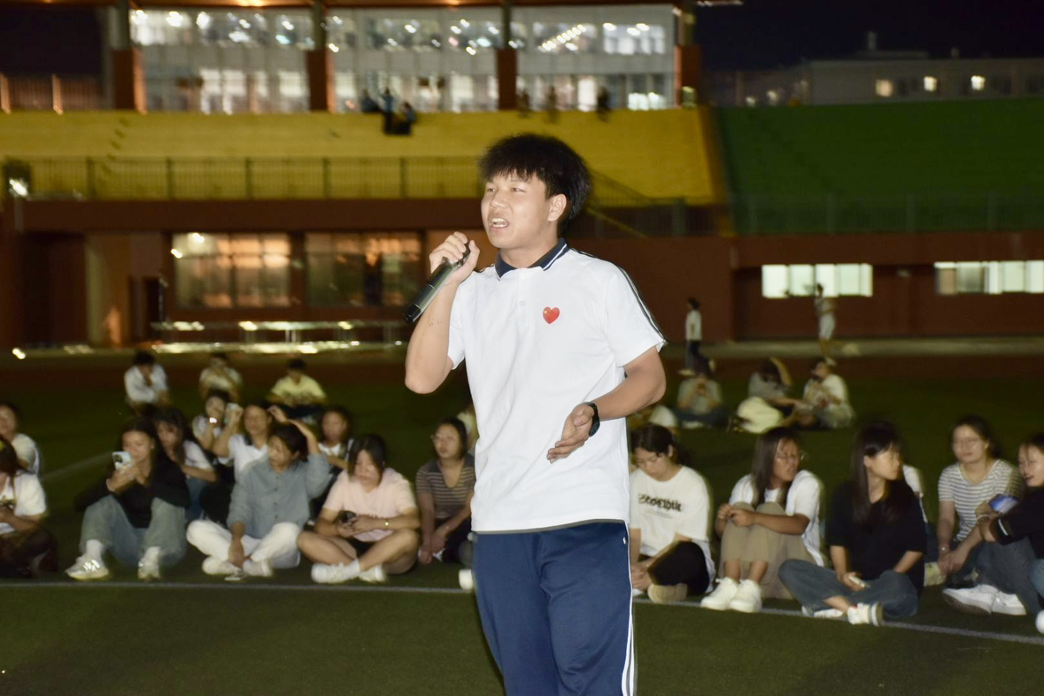 在领舞同学的带领下,大家围成一圈,晚会现场气氛瞬间被点燃,大家用欢快的舞蹈表达内心的热情,夜色下宁静的田径场顿时热闹了起来