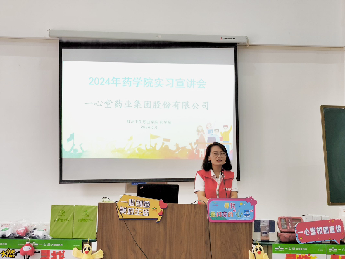 为推动校企深度合作,更好地为同学们搭建就业平台,药学院于5月8日在大教室西1-3开展了一心堂药业集团股份有限公司(以下简称一心堂)2024年专场招聘会。参加本次招聘会的有一心堂红河一分部总经理段琳、人事主管张微、赵然等一心堂各级管理人员,药学院院长阳敬、副院长李丽娟及药学院2025届毕业生。此次招聘会由药学院副院长李丽娟主持。