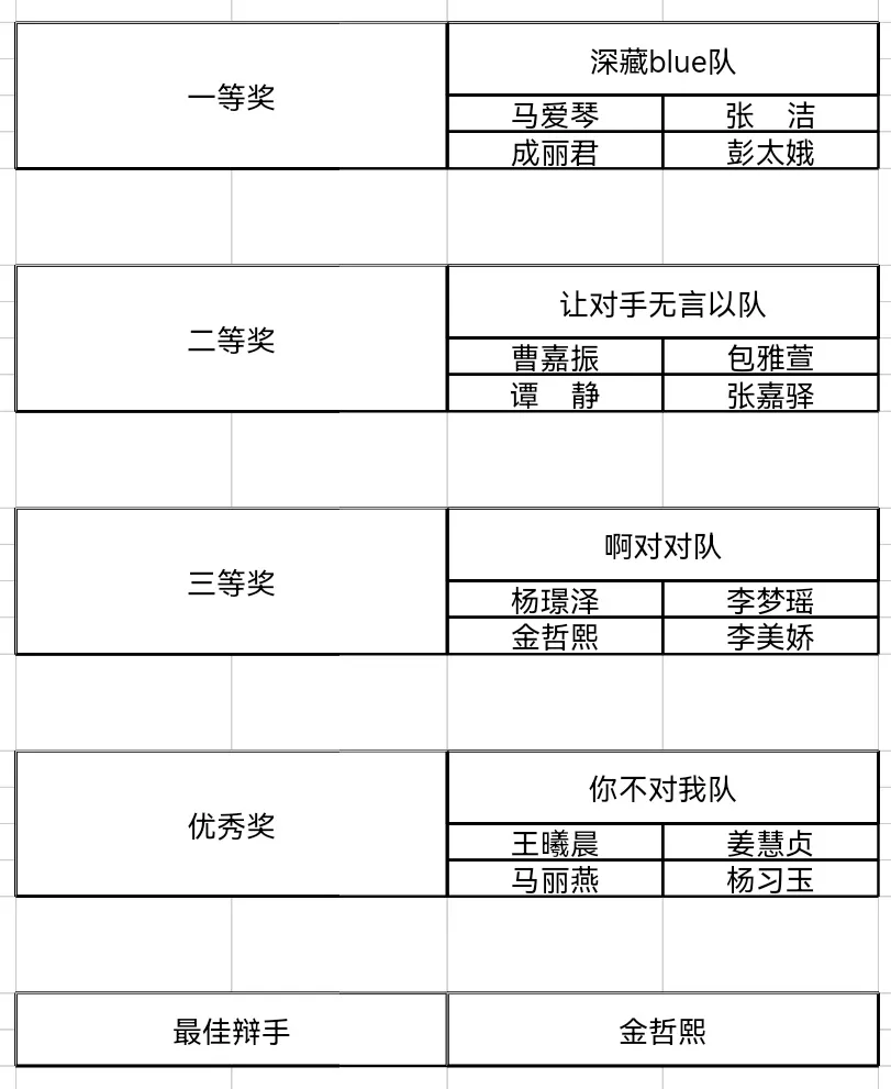 经过激烈角逐,第一组辩题:“谈恋爱弊大于利”深藏Blue队胜出,第二组辩题:“我因为太胖,被同学嘲笑,我不该减肥”啊对对队胜出。
