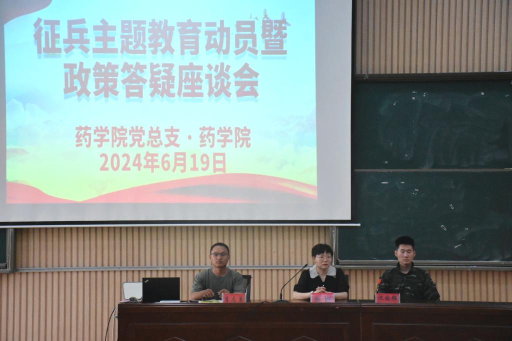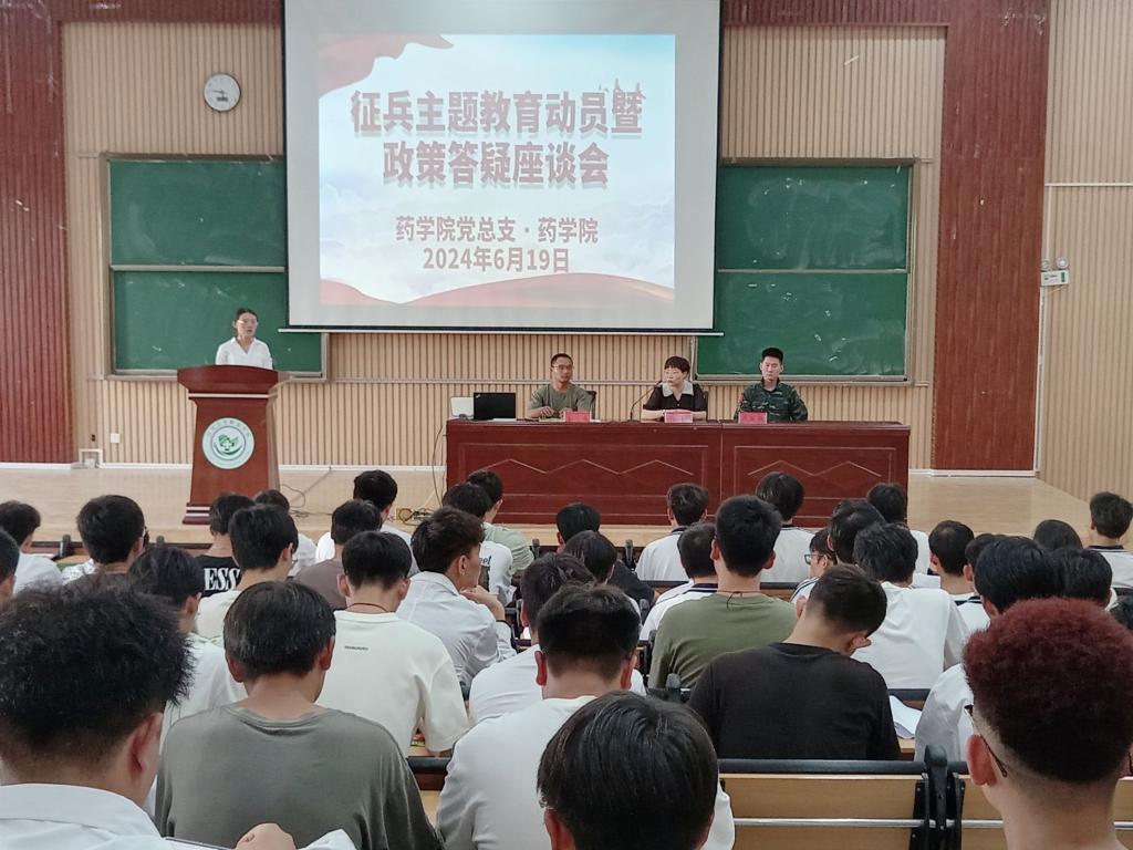 为鼓励同学们积极响应国家号召,为国家安全贡献青春力量,药学院党总支于6月19日下午在教学楼阶梯教室开展征兵主题教育动员暨政策答疑座谈会。参加本次活动的有药学院党总支书记张郴,校武装部李志勇老师,退役复学学生沈国强以及22级、20级的在校男青年。本次座谈会由刘玉红老师主持。