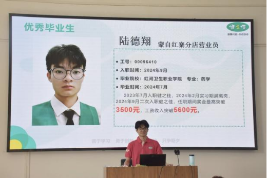 来自蒙自红寨分店的优秀毕业生陆德翔作为员工代表,结合自身从校园走向职场的成长经历,向学弟学妹们分享了在健之佳的工作心得。他以自身克服业务挑战、实现职业成长的鲜活故事,生动展现了企业提供的发展机遇与个人奋斗的重要性,并鼓励同学们在职业道路上保持进取之心,主动把握机会,在实践中积累经验,实现个人价值与职业理想。陆德翔真挚的分享引发在场同学的强烈共鸣,为大家树立了可借鉴的榜样。