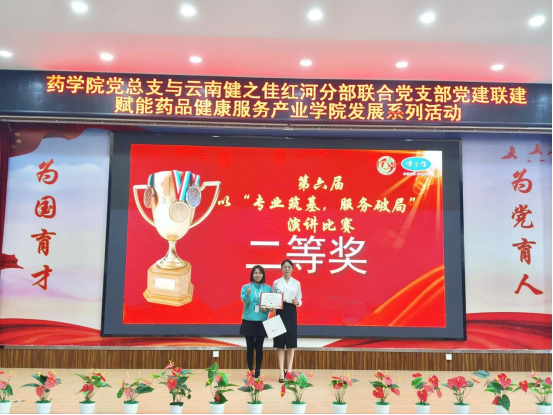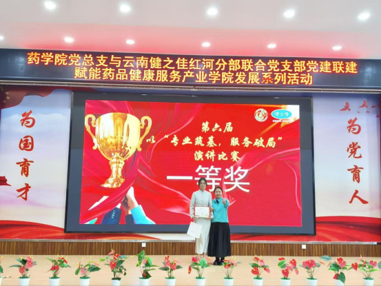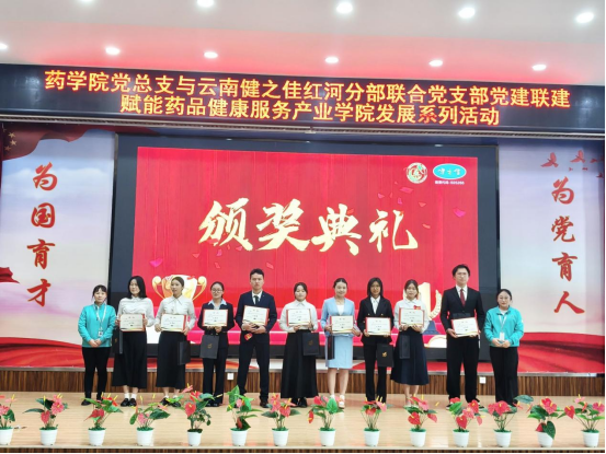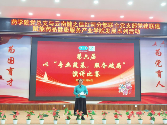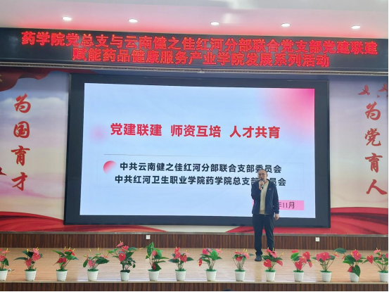2025年11月26日下午,在厚德楼博闻报告厅,药学院党总支与云南健之佳红河分部联合党支部成功开展党建联建活动。双方以“传承红色基因,共筑健康未来”为主题,通过举办健之佳第六届演讲比赛、深化校企师资互培等一系列活动,共同赋能药品健康服务产业学院的高质量发展。红河一区地区经理黄芳、红河分部人事经理曹钟慧等一行5人,以及药学院党政领导、党员教师及代表、学生代表参加了此次活动。