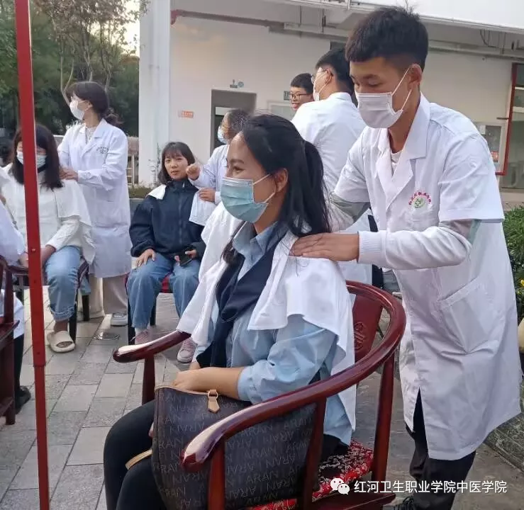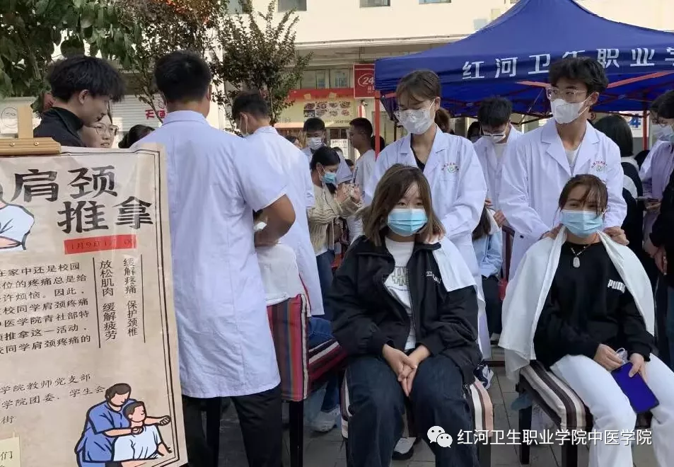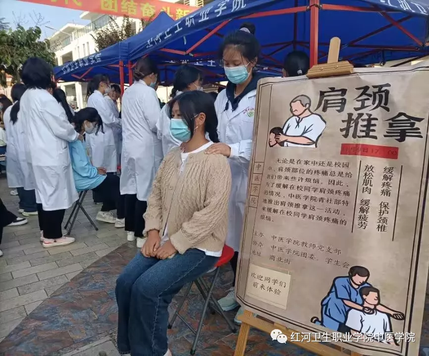 新时代,青年人应以进取的姿态迎接党的二十大,以青春的热血和活力肩负民族的希望。为响应二十大的号召,2022年11月9日,红河卫生职业学院中医学院青年发展与社会工作部面向全校举办了一场别开生面的推拿按摩活动,旨在提升学生们的专业素养, 锻炼学生们的实际操作能力,在丰富日常生活的同时更好地宣传中医文化,更好地发扬医者精神。