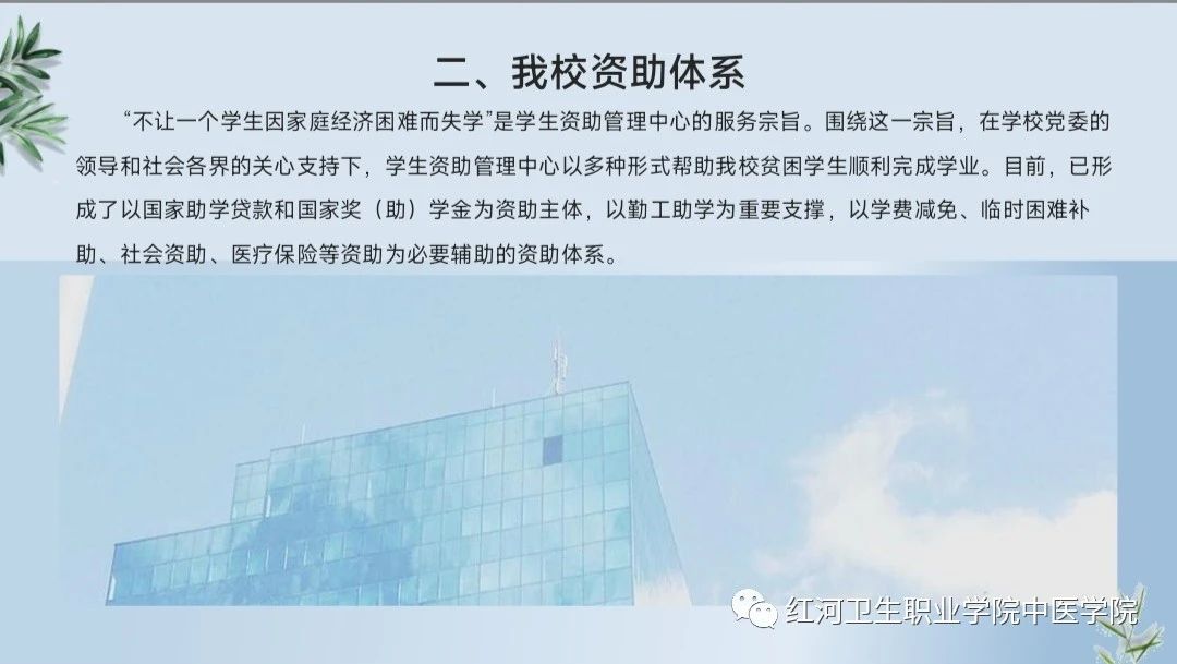 学生资助是党和国家的重要民生工程。为进一步加大学生资助政策宣传力度,贯彻落实上级各项政策的相关要求,红河卫生职业校院中医学院于2023年3月24日在大教室(一),开展了学院资助政策宣讲,参与人员有中医学院全体辅导员、班主任、各级班委及代表,此次宣讲由中医学院负责资助工作的辅导员邱晓雪负责。