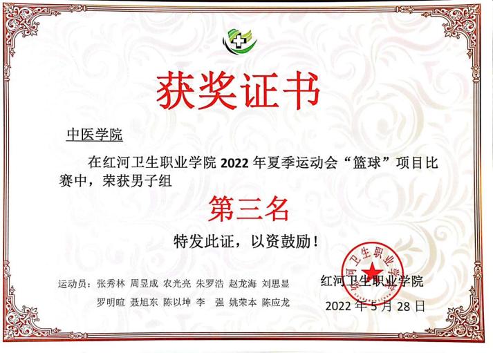 中医学院在红河卫生职业学院2022年夏季运动会“篮球”项目比赛中,荣获男子组 第三名;