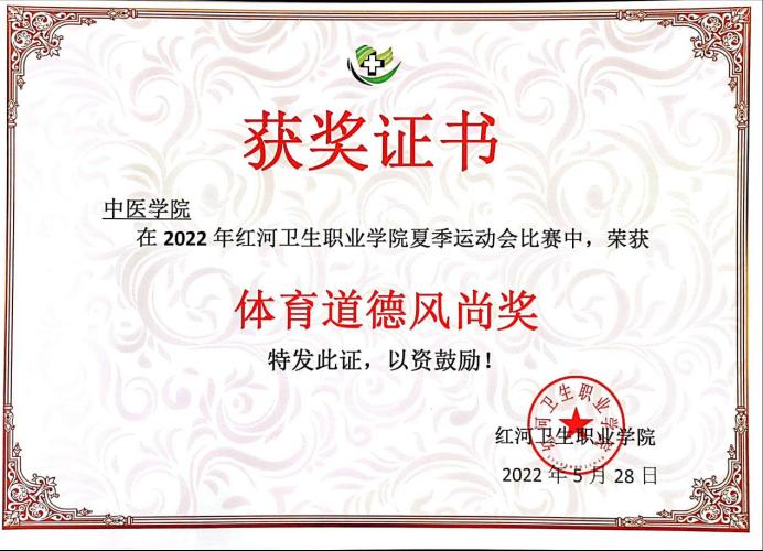 中医学院在红河卫生职业学院2022年夏季运动会比赛中荣获“体育道德风尚奖”