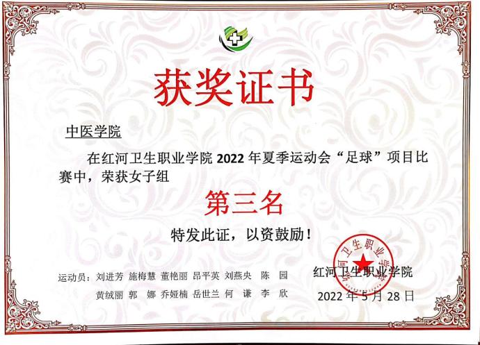 中医学院在红河卫生职业学院2022年夏季运动会“足球”项目比赛中,荣获女子组 第三名;
