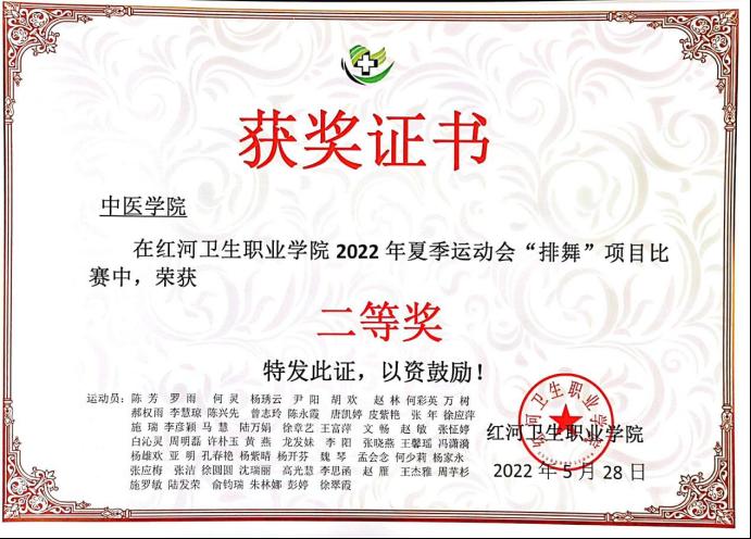 中医学院在红河卫生职业学院2022年夏季运动会“排舞”项目比赛中,荣获二等奖;