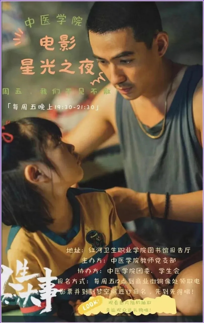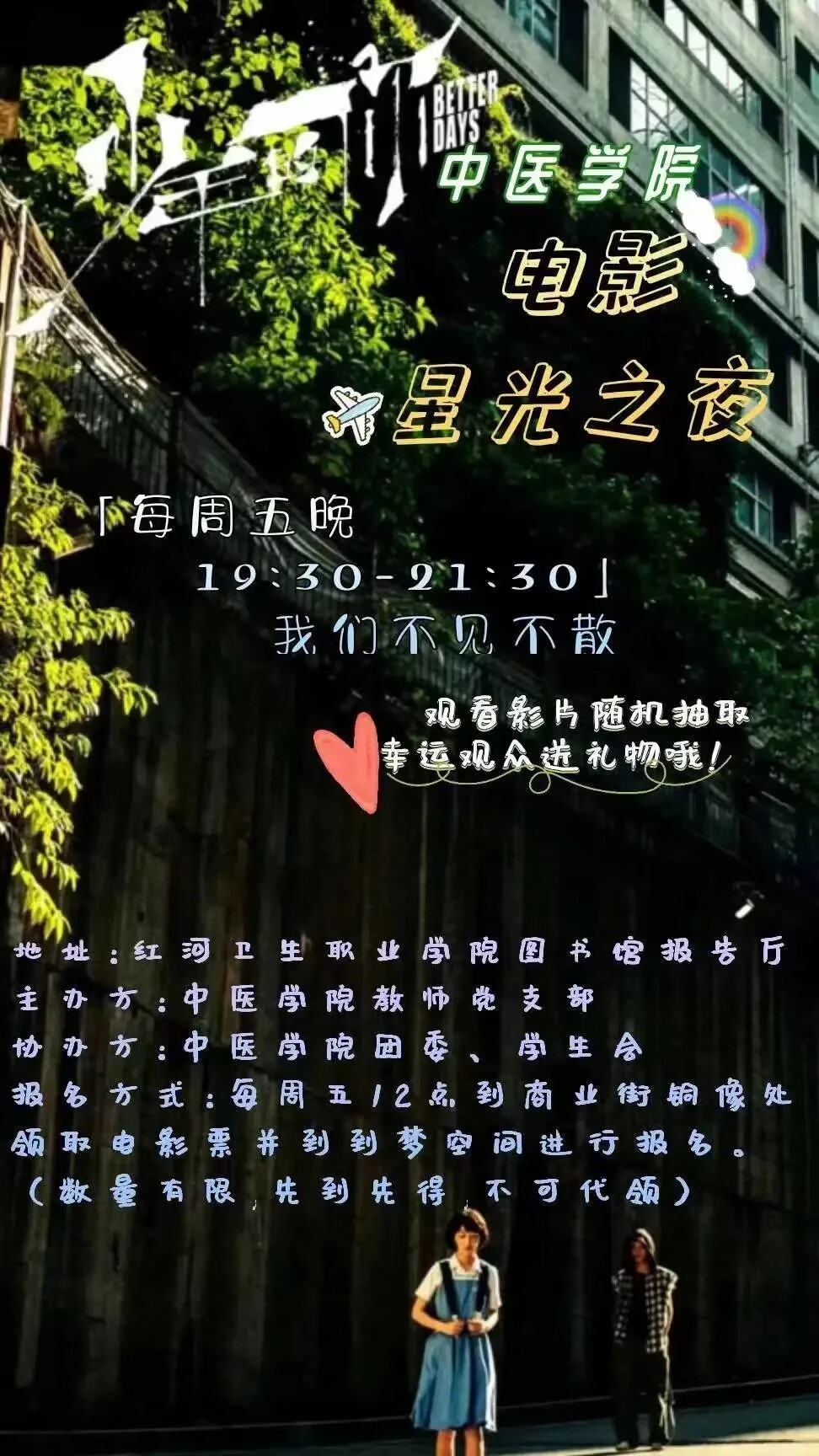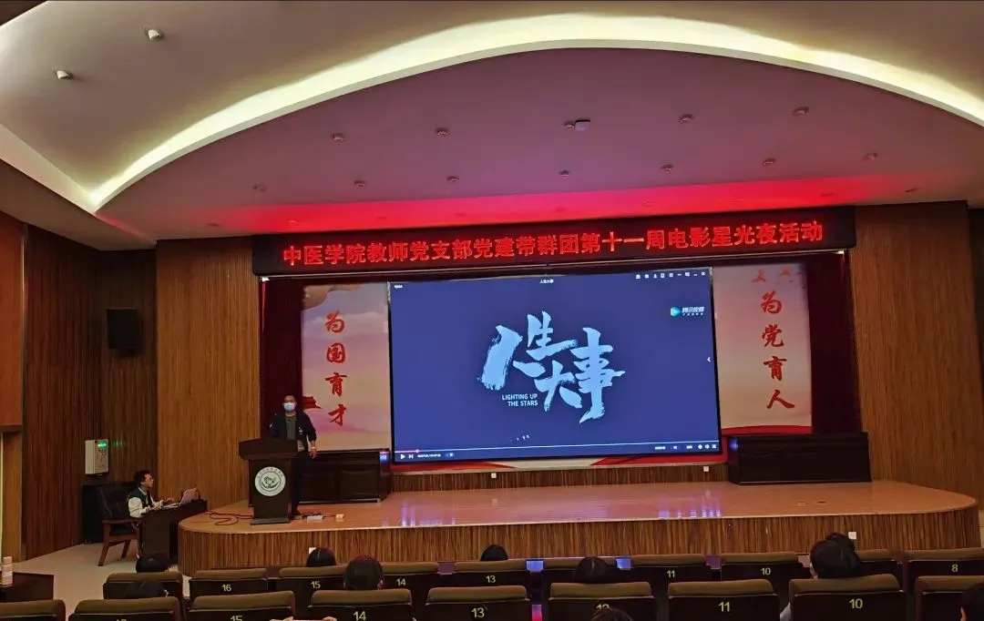 走近一段电影,感悟一段人生。为充实校园文化生活,丰富同学们的精神世界,2022年11月4日,由红河卫生职业学院中医学院教师党支部主办,中医学院团委、学生会协办的电影星光夜暨醇美青春,邂逅光影系列活动。参与此次活动的人员有中医学院党支部副书记龙学云、总辅导员董超及100余名在校生。