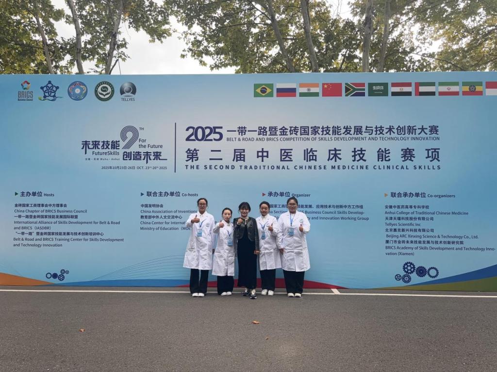 2025年10月25日,第二届“一带一路”金砖国家技能发展与技术创新大赛中医临床技能赛项在安徽中医药高等专科学校成功举办。本次大赛汇聚了全国49支优秀代表队同台竞技,红河卫生职业学院中医学院代表队凭借扎实的专业基础和稳定的现场发挥,最终荣获大赛三等奖。我校参赛队由中医学院曹雪辉老师带队,成员包括23级针灸推拿1班许佳蕊、汪思宇,23级针灸推拿2班杨梓倩、余游四位同学。在曹雪辉、杨艳蓉两位老师的悉心指导下,参赛选手在比赛中沉着应战、团结协作,充分展现了扎实的中医临床辨证思维和娴熟的针灸推拿操作技能。