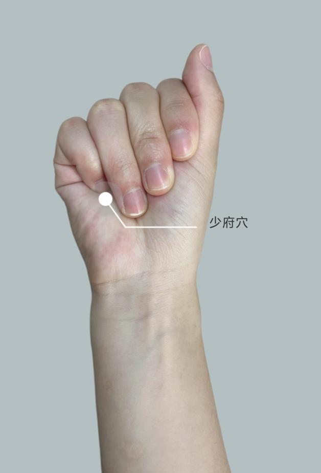 取穴:轻握拳,小拇指指尖下即为少府穴。