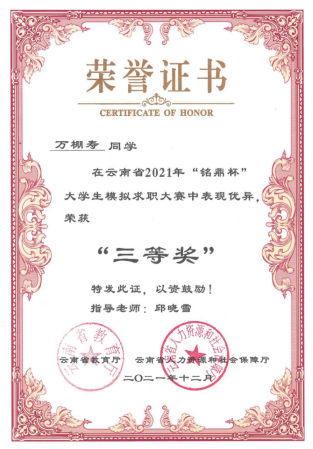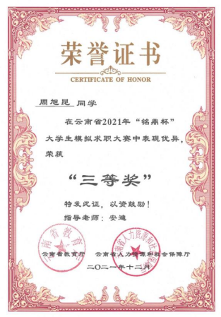 在校级赛中,我院参赛选手表现出色,取得优异成绩。我院推选参加校级简历设计大赛的3位同学中2人获得二等奖,1人获得三等奖,3人均入围省赛,占学校参加省赛人数的30%;推选参加校级模拟招聘大赛的3位同学分别获金奖、银奖、铜奖,3人均入围省赛,占学校参加省赛人数的43%。同时,我院以初赛完成率、校级赛完成率、获奖率均靠前的成绩荣获2021年大学生模拟求职大赛“优秀组织奖”。