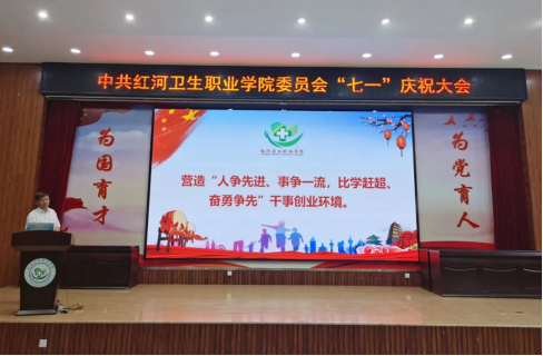 为庆祝中国共产党成立101周年,表彰先进、树立典型,2022年7月1日下午,中共红河卫生职业学院委员会在图书馆报告厅举行了“七一”庆祝大会,学院党委班子成员、各基层党组织书记、全体在职党员、退休党支部党员代表以及预备党员、部分入党积极分子共208人参加会议。大会由学院党委副书记、院长唐飚主持。