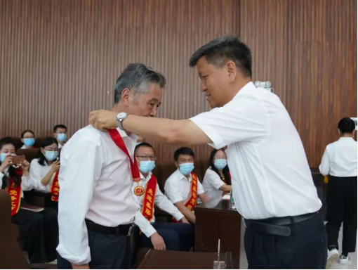 讲话结束后,学院党委书记张云学为光荣在党50年的李富才同志佩戴了由中共中央颁发的“光荣在党50年”纪念勋章。