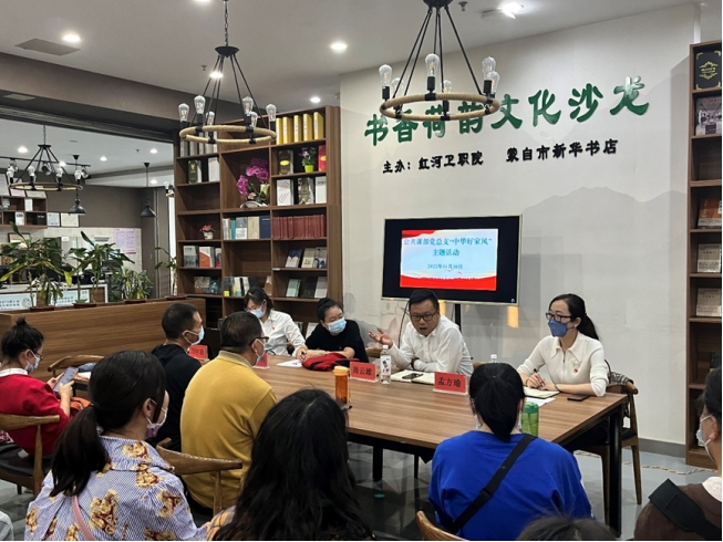 为认真贯彻落实党的二十大报告中关于“注重家庭家教家风建设”的重要论述,通过身边人分享身边事,以“家风”带“学风”,“家风”促“校风”,公共课部党总支于2022年11月30日下午在图书馆三楼书吧开展“中华好家风”主题活动。学校党委副书记周云雄出席活动,学校原副校长、公共课部退休教师吉好利,校团委副书记、公共课部优秀青年教师万宇羽到场进行主题分享,公共课部党总支书记孟方瑜主持活动,公共课部党总支党员、外语教研室教师等30余人参加活动。