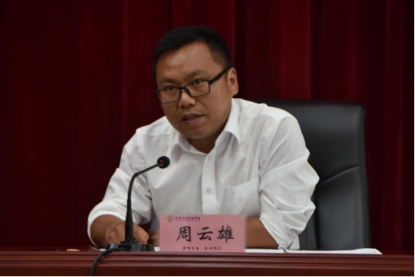 学校党委副书记周云雄同志代表学校党委班子表态:一是坚决拥护州委的决定,此次党委主要领导的调整,不仅为新时期红河卫生职业学院的发展夯实了队伍,而且为我校“双高”建设增添了新的活力,体现了州委对学校发展给予的关心和寄予的厚望;二是始终坚持团结拼搏的状态,近年来,我校建设和改革发展各项事业取得了长足进步,学校面貌发生历史性变化,办学条件和办学质量有了大幅提升,这些成绩的取得,得益于上级党委政府的正确领导和上级各部门的关心支持,得益于学校党政班子的精诚团结和坚强领导,更得益于全体教职工的共同努力、拼搏奋斗。在今后的工作中,学校党政班子将继续发扬“团结拼搏”的优良传统,认真贯彻落实党委领导下的校长负责制,加强组织领导、民主管理和监督,认真落实好从严治党责任,抓好新形势下学校党的建设、意识形态工作、“清廉学校”建设、学校改革发展等各项工作,推进作风革命、效能革命,拧成一股绳、铆足一股劲,补短板、强弱项、扬优势,全面推进“双高”校建设,不断开创学校改革发展新局面;三是全体干部教职员工一定要做到讲政治、顾大局,切实把思想和行动统一到州委的决定和部署上来,以实际行动支持好王必成同志的工作,为实现建成滇南领先、省内一流、有影响的集教育培训为一体的沿边特色高水平医药卫生高等职业院校发展目标不懈奋斗,为国家、为社会培养输送更多适应边疆少数民族地区基层医疗卫生事业和大健康产业所需的应用型“专业化、职业化”医药卫生技术技能人才,努力办好人民满意的教育!