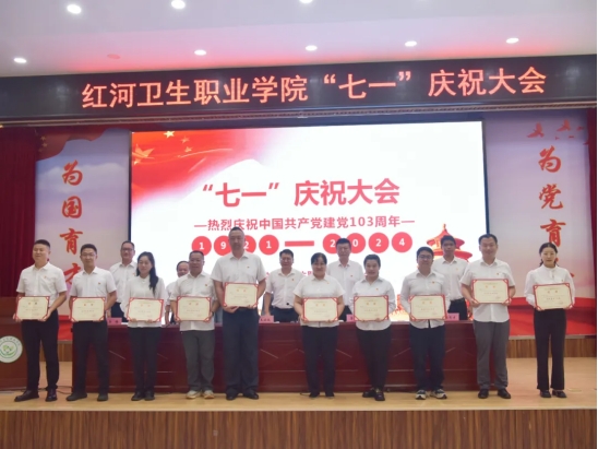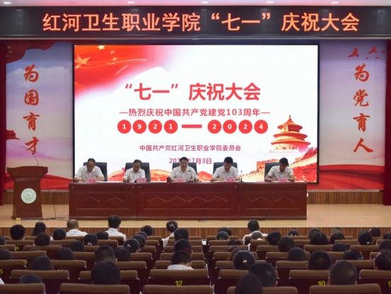 砥砺初心担使命,踔厉奋发勇作为。2024年7月3日,红河卫生职业学院召开庆祝建党103周年暨表彰大会,学校党委班子成员、各党总支(支部)书记、全体党员、退休党支部党员代表共计 150 余人参加会议。会议由党委副书记、院长唐飚主持。