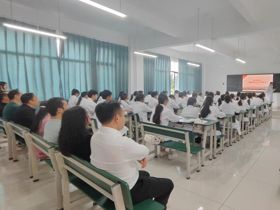 支部党员走进思政课堂,坐在教室里和学生们一起听课,通过“看、听、研、学”的形式沉浸式参与《习近平新时代中国特色社会主义思想概论》教学实践。课堂上,思政课教师组织学生开展新闻速评,学生分组热烈讨论和回答“我国发展新的历史方位”“‘四个自信’来源”等问题,通过“学生互评+教师点评”的方式引导学生思考如何在医疗卫生事业中践行初心使命。